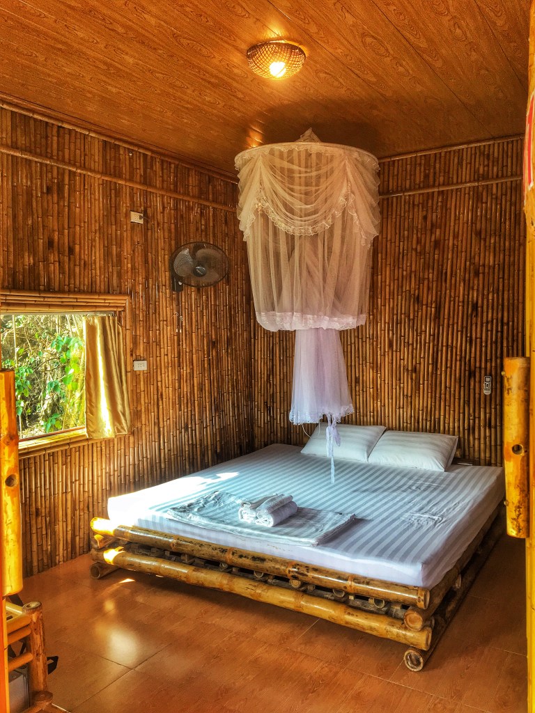 Ham Rong Homestay : eco-friendly bamboo rooms. The place also has a restaurant on site, happy to cater for vegans. Staff is very friendly and happy to assist with any request. They also offer free luggage deposit and shower service for travellers waiting to catch the overnight train to Da Nang (which was our case)