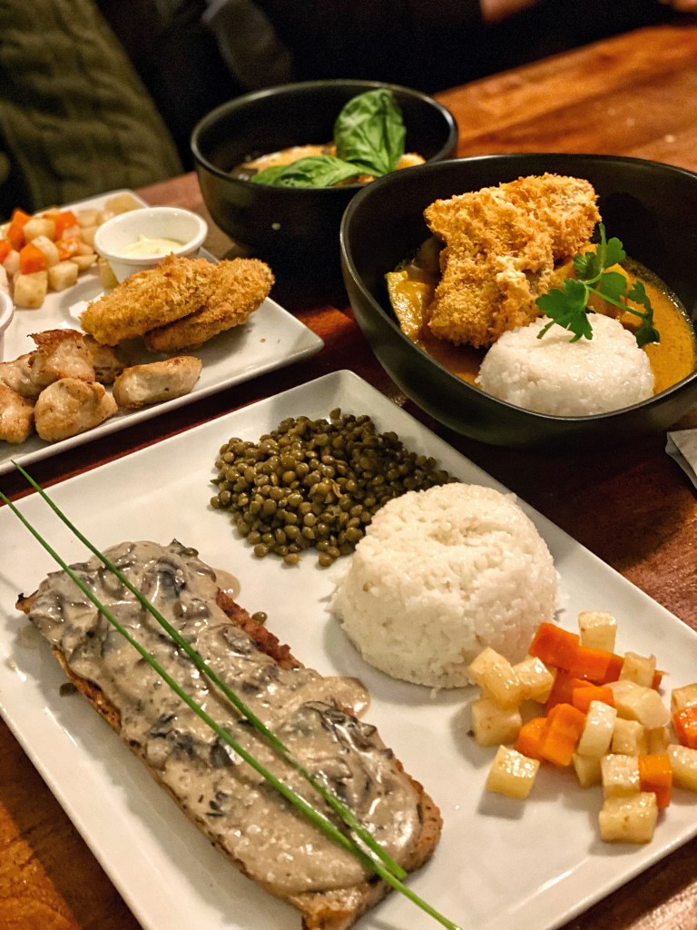 Veget’Halles offers a fusion French-Asian menu, with dishes made of healthy and nutritious ingredients. We visited the place with some friends and shared a couple of options : an entree with mixed types of pates and homemade spreads (including a veganised foix gras), a Seitan scallop dish with mixed veggies, legumes and mushrooms, and the “Assiette du Sportif” : a huge plate with different types of plant based meats, mixed veggies and rice.